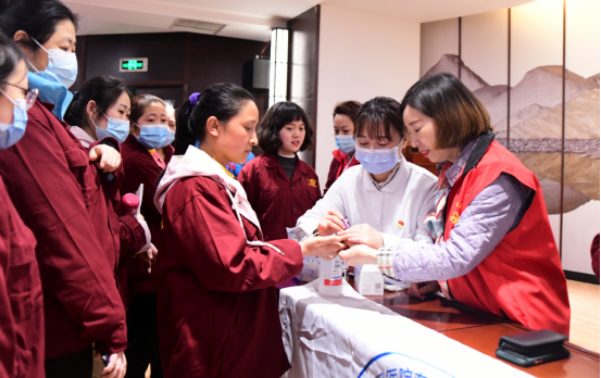工作人员为奋斗在一线岗位上的女神们送上节日鲜花。
