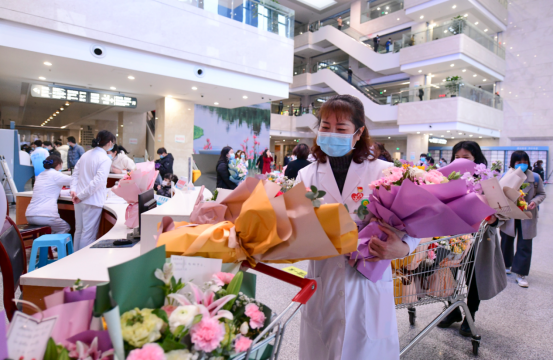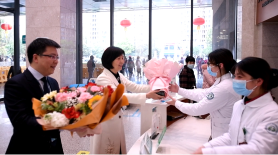 党委副书记、院长朱堂棋为门诊药房工作人员送去鲜花。