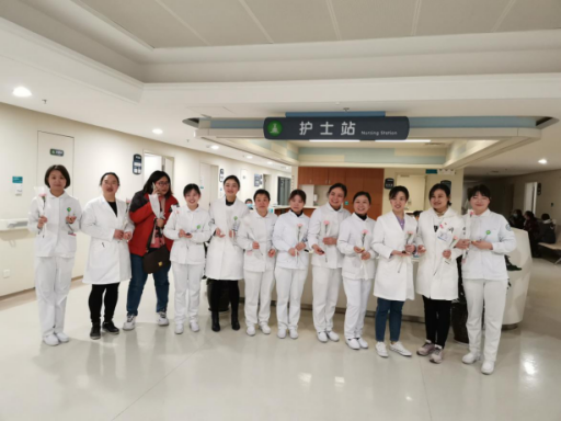 党委书记刘鸿(右一)为咨询台护士送上鲜花及节日祝福。