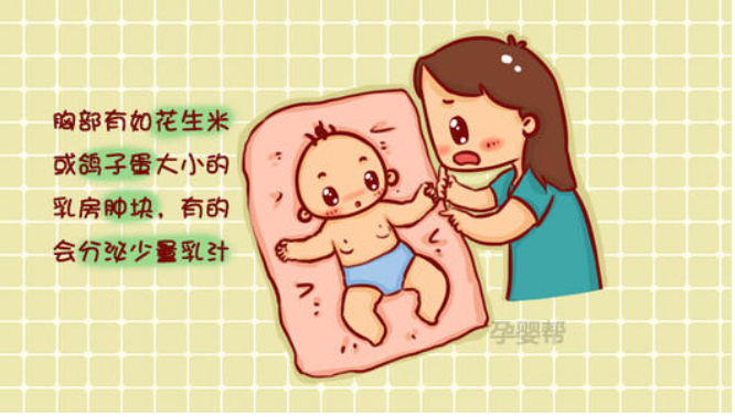 刚出生的新生儿,由于受到母体激素的影响,生后1周左右部分宝宝可能出现乳腺增大,如蚕豆大小,甚至出现乳晕及泌乳情况,2-3周可消退,不可挤压,以防感染。