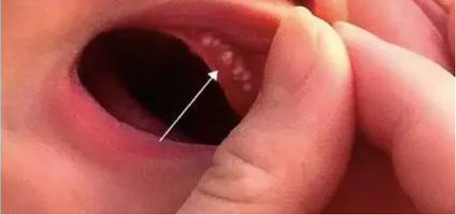 新生儿牙龈上出现的黄白色小颗粒,称为马牙,硬腭中线上大小不等的黄色小结节,称为彭氏珠,都是由于上皮细胞堆积形成,可自行消退,切勿挑破,以防感染。两侧颊部各有一个隆起的脂肪垫,称为“螳螂嘴”,有利于吸吮乳汁,不可挑破。
