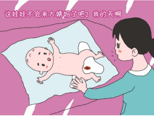 部分女婴,由于出生后母体雌激素对胎儿的影响中断,在生后5-7天左右出现灰白色黏液分泌物从阴道流出,可持续2周,有时为血性,故称为“假月经”。无需处理。