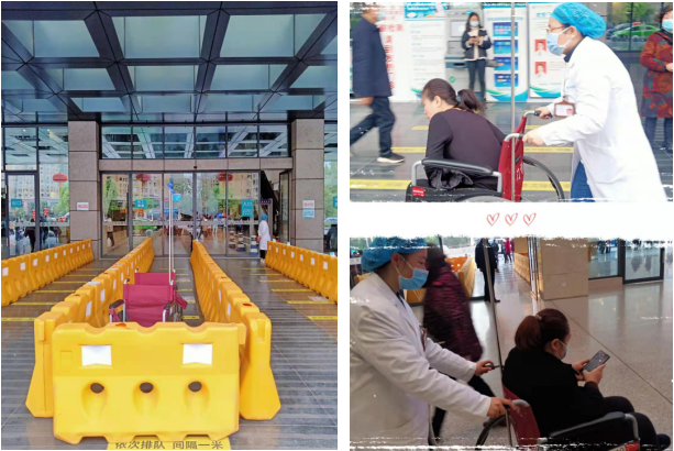 3月18日上午,一位脚部受伤来医院就诊的患者在璧山区人民医院大门前下了车,由于脚伤行动不便,他单脚一蹦一跳地进入医院,刚到医院门诊入口,就有工作人员推着一辆“暖心轮椅”来到他的身旁。