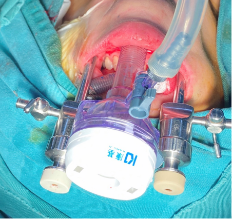 传统开放手术会在颈部留下5厘米左右的疤痕,考虑到患者提出的“术后不留下明显疤痕”的希望和要求,甲状腺外科覃勇、彭禄荣医师经过术前充分讨论,决定采用经口腔前庭入路腔镜甲状腺手术,术中仅于口腔前庭粘膜切开1个1.5cm、2个0.5cm小切口,并通过腔镜完成手术。