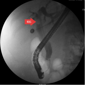 第三步:插管成功后,注入造影剂,造影显示胆总管结石。(箭头所指为胆总管结石)