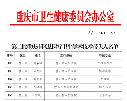 近日,重庆市卫生健康委员会办公室发布了《关于公布第二批重庆市区县医疗卫生学术技术带头人人选名单的通知》。我院共有4位专家上榜,分别是刘光碧、刘碧翠、乐发国和何斌。