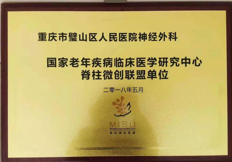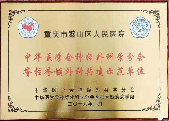 重庆医科大学附属璧山医院(重庆市璧山区人民医院)神经外科脊柱脊髓专业组,目前是中华医学会神经外科分会脊柱脊髓外科共建示范单位,国家老年疾病临床医学研究中心脊柱脊髓微创联盟单位,重庆市医学会神经外科分会脊柱脊髓学组副组长单位。常年开展各种颈椎病,腰椎病,脊柱脊髓外伤,脊柱脊髓肿瘤以及颅颈畸形的微创手术治疗。率先在区县级医院开展上颈椎手术,擅长各类颈椎间盘及腰椎间盘突出微创手术,并处于领先地位。