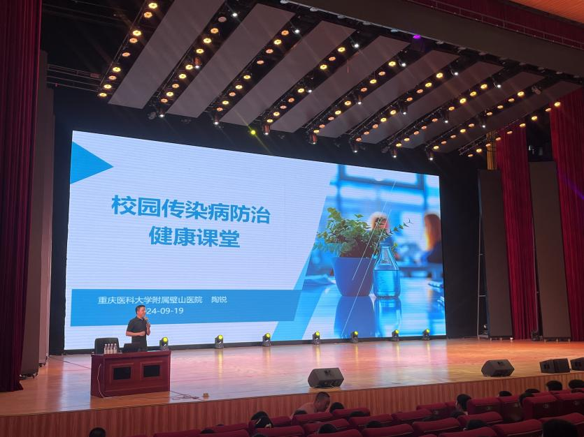 近日,重庆市璧山中学(枫香湖校区)开展“初一学生行为规范教育活动”,我院肝胆胰外科、肥胖与代谢病中心 陶锐教授任学校健康副校长受邀参加,走进校园为学校初一新生开展“校园传染病防治健康课堂”以及“预防儿童青少年肥胖”主题科普宣讲活动。