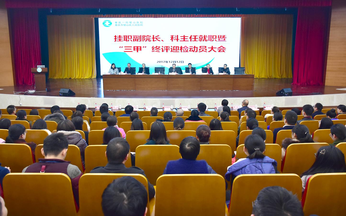 我院“三甲”创建工作进入决胜关键时期,为统一思想,凝心聚力,12月12日,医院召开“挂职副院长、科主任就职暨 ‘三甲’终评迎检动员大会”。重医一院副院长吕富荣、区卫生计生委主任柯真碧以及重医一院4位挂职专家出席会议。会议由院党委书记刘鸿主持。我院班子全体成员、中层干部、创建骨干、质控骨干等近500人参会。 会上,重医一院副院长吕富荣作了“等级医院评审迎评准备”专题培训,就现场评审发现的问题进行了梳理,并结合院本部迎评经验,为医院迎评工作提出了建设性的指导意见。区卫生计生委主任柯真碧受区委、区政府委托,对我院提出明确要求:一要凝聚共识,深刻认识“三甲”终评的重大意义;二要齐心聚力,确保创建既有份量又有质量;三要明确责任,确保“三甲“终评一举成功。挂职副院长蒋迎九在会上强调了各科室在迎评工作中的主要责任,并激励大家向着“三甲”终评奋力拼搏!挂职专家们也纷纷表示,将借力院本部资源并充分发挥自身优势,助力区人民医院奋战“三甲”终评。 院长朱堂棋在动员讲话中要求,全院上下要认清形势、强化监管、严肃纪律,确保“三甲”的最后胜利。党委书记刘鸿总结强调,璧医人要以“从不退缩、从不畏惧、直面困难”的勇气,要以“不夺三甲誓不还”的士气,披荆斩棘、锐意进取、冲刺“三甲”! (党委办 胡秋雨/文 胡悦建/图)