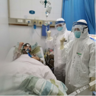 令我们印象最深刻的,还是15床的那位患者爷爷,他是我们病区病情最危重的患者。2月8日,我们还是和往常一样穿好防护服来到隔离病房,第一件事就是看一下老爷爷。“爷爷,今天感觉怎么样啊?”爷爷年纪大了,听力不太好,我用比较大的嗓门对着老爷爷说。然而,爷爷似乎没怎么回应我,过了一会儿,他才反应过来,对着我们点点头,我从他的脸上看出今天精神没有昨天好。心里时刻提醒自己,“一定加强巡视,病情可能随时发生变化。”随后,我们开始一天的工作:分发早餐、给患者打开水、发口服药、输液、抽血、留置针穿刺……,虽然繁忙,但大家各司其职、分工合作、有条不紊。突然,耳边传来几声呼吸机的警报声,我赶紧跑进老爷爷的房间:“爷爷,您怎么了?您怎么了?”我看爷爷呼吸频率很快,心电监护仪上的氧饱和度只有56%,我再看呼吸机,不好,呼吸机氧浓度只有23%。我立即断掉呼吸机面罩,给予外部高流量吸氧,同时呼叫同事帮忙并通知医生,我一边安慰爷爷,一边查找原因。很快,原因找到了,原来呼吸机氧源接口除了故障,经过处理后呼吸机的氧浓度恢复正常。我随即将呼吸机面罩给爷爷戴好,并将氧浓度调整到80%。我们陪在爷爷身边,看着氧饱和度一点点升上来,终于升到了90%以上,终于松了一口气。后来,由于爷爷的病情不得不转入重症监护室继续接受治疗,但在我心里,一直牵挂着他,也衷心祝愿他老人家能早日康复!