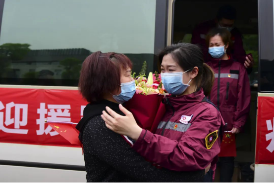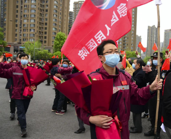 在市民和医护人员的夹道迎接下,队长刘碧翠高举凯旋的旗帜,踏着胜利的步伐,朝着家的方向前进。