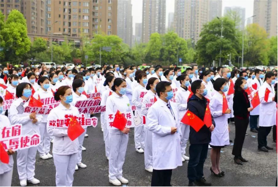 仪式上,队长陈飞汇报在湖北孝感的工作情况,表示今后将在自己的工作岗位上时刻践行“敬佑生命、救死扶伤、甘于奉献、大爱无疆”的医者使命,把人民群众的生命健康放在首位,关键时刻冲得上去、危难关头豁得出来,召之即来,来之能战,战之必胜。