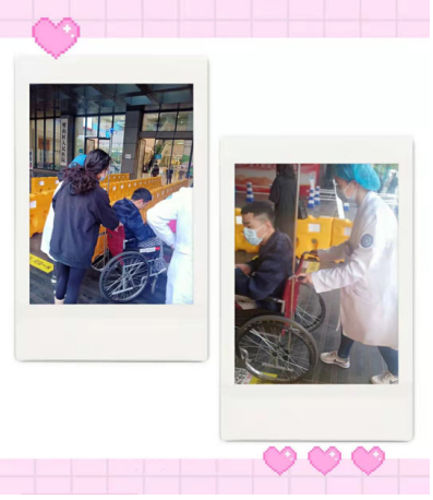 3月18日上午,一位脚部受伤来医院就诊的患者在璧山区人民医院大门前下了车,由于脚伤行动不便,他单脚一蹦一跳地进入医院,刚到医院门诊入口,就有工作人员推着一辆“暖心轮椅”来到他的身旁。
