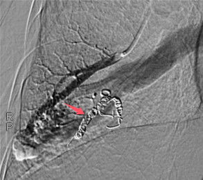 患者,男,61岁,近三年来反复因头晕、呼吸困难、血红蛋白异常增高,辗转于重庆市多家医疗机构治疗,考虑红细胞增多症,并多次行放血治疗,治疗效果不佳,遂来我院呼吸与危重症医学科门诊就诊。副院长刘碧翠主任医师结合患者的结果,以及肺部CT多发团块影,高度怀疑为动静脉瘘引起血红蛋白异常升高,遂收住院进一步检查。入院后,通过支气管动脉CTA检查,确诊为肺动静脉瘘。呼吸与危重症医学科李奎副主任医师遂带领血管介入团队经过术前认真讨论,严密制定了手术计划,征得患者及家属同意后,完成了经皮肺动脉造影加双侧肺动脉栓塞术。术中患者氧饱和度在不吸氧的情况下从80%立即提升至95%,手术效果显著,术后恢复良好,顺利出院。
