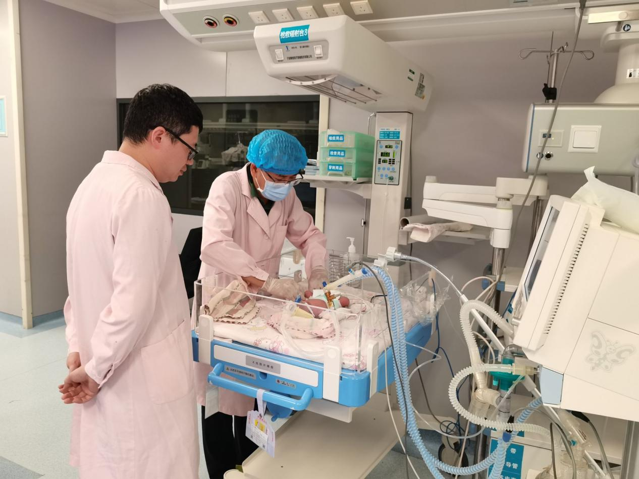 宝宝出生时自主呼吸弱、反应差,不久即开始出现呼吸急促、呻吟,在产房医护团队的护送下紧急转至新生儿科。新生儿科医护团队立即实施抢救,整个过程紧张有序,确保宝宝生命体征稳定。