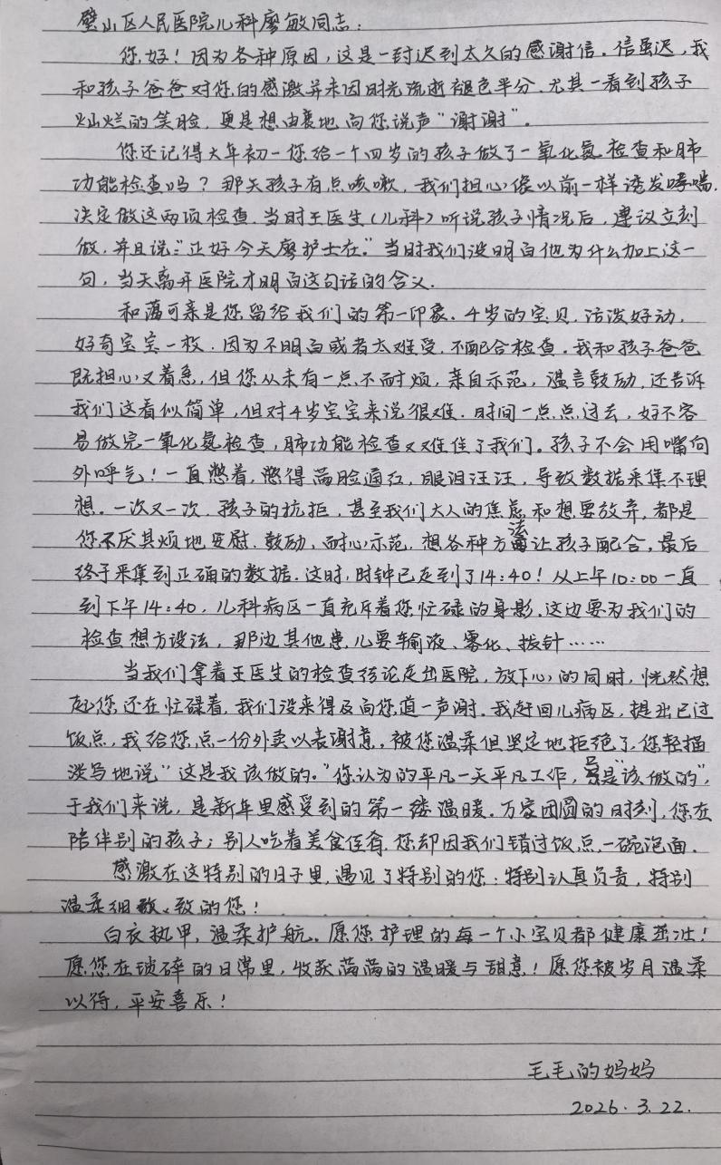 近日,一封来自患儿家属的感谢信送到了我院儿科,纸短情长,字里行间满是对儿科护士廖敏的感激与赞誉,也让这个春天的医患温情愈发动人。
